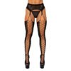 Diseño: Malla de red con un patrón de rombos y círculos que atraviesa las piernas, creando una silueta impactante y sofisticada. La parte superior tiene un detalle de liguero que realza aún más la figura.