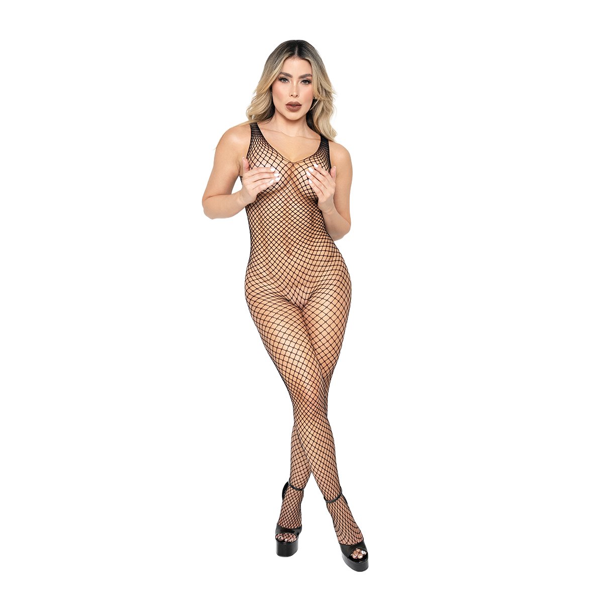 Diseño: Body de malla con tiras cruzadas en la parte central, combinado con medias de red que alargan tus piernas y añaden un toque de provocación.